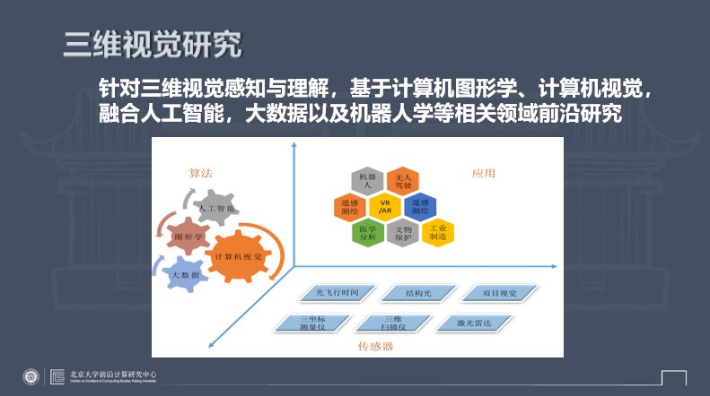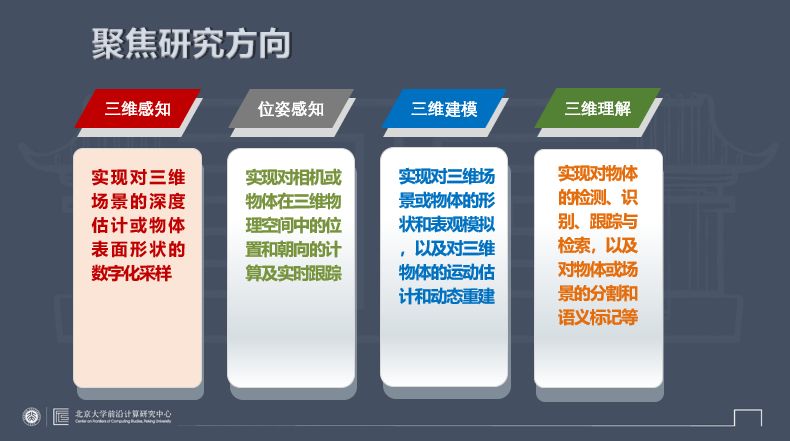 首先是三维感知,也就是感知三维空间,获取和处理三维深度等;然后是位置感知,比如感知相机的位置等;第三是三维建模,不仅对场景有基本的深度感知,还要获得关于场景完整几何模型的描述。最重要的就是三维理解,对场景和其中的物体从三维空间来进行理解。