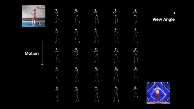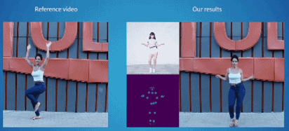 比如,下面的动图中有两个人在跳舞,但是每个人的动作方向、脸部朝向、身高都有所不同。像这样一个运动的定向差值,都是通过隐式三维理解和编码实现的。