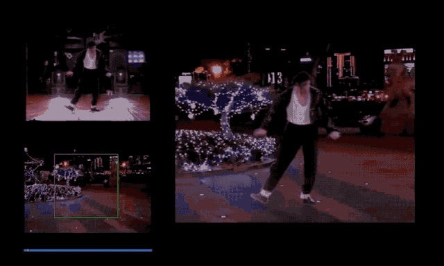 上面是一段表演视频,我们可以提取它的一部分三维骨架信息,驱动一个不会跳舞的人来跳舞。左边的这个人假设不会跳舞,她只是做几个动作,右边大图里面左上角是真正会跳舞的舞者,我们用她的专业动作来驱动不会跳舞的人来跳舞。就是通过对“驱动”视频进行三维理解并“迁移”三维动作到参考视频中的人物而并合成新的视频,于是在右边大图里,这位女士也会跳舞了。