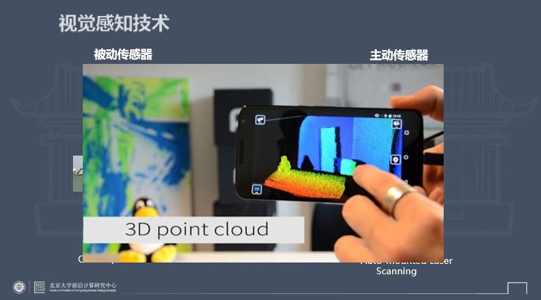 三维视觉的发展得益于视觉传感器的发展,而传感器大致可以分为两类,一类是被动传感器,现在我们用的各种相机就是被动传感器。另一类就是主动传感器,比如激光扫描,以及各类以主动发射信号为主导进行测量的传感器。大家知道,随着手机的快速发展,未来的手机会同时配备两类传感器,也就是深度传感器和传统的颜色传感器。