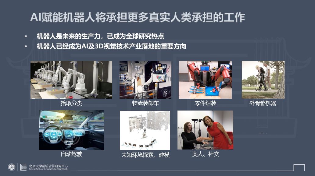 面向物流领域的应用,我们还尝试了一个机器人搬箱子的测试。在去年京东“双11”期间进行了10天的压力测试,机器人在现场代替一组人(两人一组)去识别箱子、搬箱子,并把大大小小不同的箱子搬到传送带上。这是我们的技术第一次从学校的实验室走进现实场景中。但是我们也感受到,越走近现实场景,问题就会越复杂。在座有很多企业界的人,欢迎各位能过来跟我们交流合作。