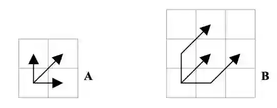 A 所对应的即为传统 DTW 的递归式,下一步只能在距离矩阵中相邻的三个方格中选取,而 B 中所对应的就是改变了 step 后的递归式。相较于 A 中,B 中对于每一个第一步没有沿着对角线方向走的方格都再朝其所在方格的对角线方向移动一步,这样即可实现改变 step pattern。