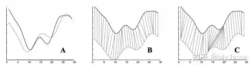 综上,在时间序列间的距离度量上,欧氏距离有以下限制:(1)只适用于处理等长的时间序列;(2)在将时间序列对齐时无法考虑 X 轴上的变化,导致有时对齐出现不自然。