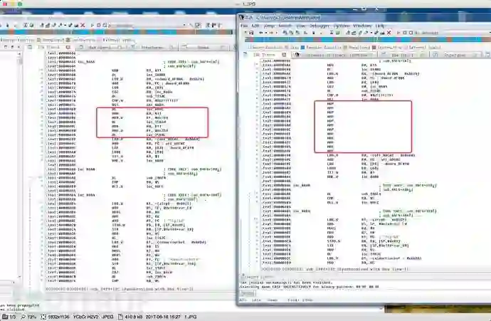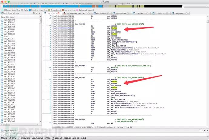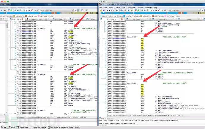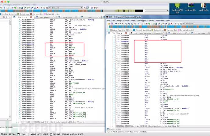 如果要直接patch adbd程序估计得花很多时间逆向分析,这里我们走一下捷径,直接分析https://github.com/alephsecurity/initrootpatch后的adbd,然后对比原来的adbd程序,分析patch点,最后根据32位程序来推测64位arm程序可能的patch点。事实证明这是一条快速通道,我们很快就对比找到了patch点: