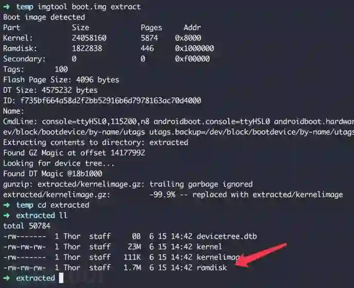 由于不同的手机系统固件不一样,initramfs也不通用,我们只有通过网上下载的对应系统固件来提取initramfs。下载固件后解压缩找到boot.img,使用imgtool工具提取内核文件: