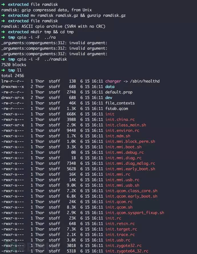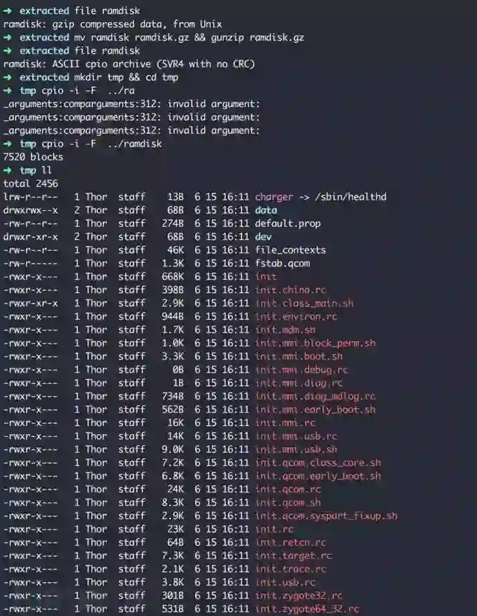 成功劫持了initramfs后,我们需要想办法替换或修改initramfs中的文件来进行root提权。我们首先解压缩initramfs,它是一个cpio打包、gzip压缩的文件: