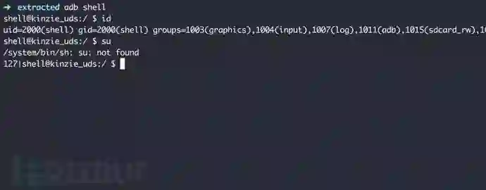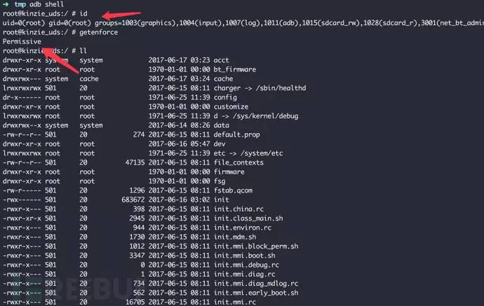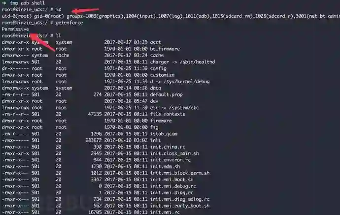 于是我们patch掉这两个地方,用patch后的adbd替换原来initramfs中的程序,重新打包运行,adb shell直接就是root权限: