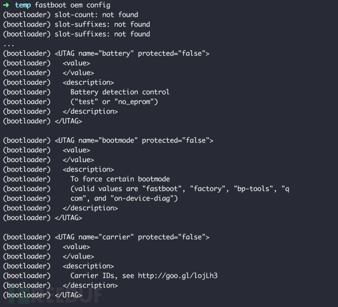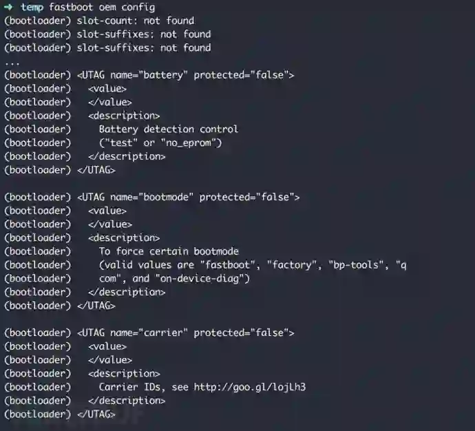 这些参数都未受保护,即使bootloader已锁,仍然可以通过fastboot oem config命令配置: