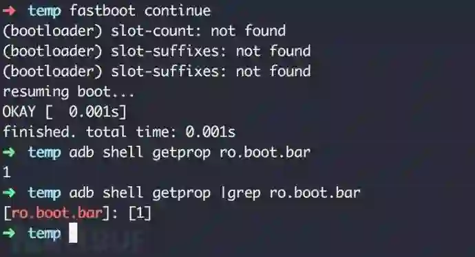 该命令注入了androidboot.bar=1参数,该参数如果注入成功,将会设置系统的ro.boot.bar属性为1。当然,这里我们只是虚构了一个bar属性。