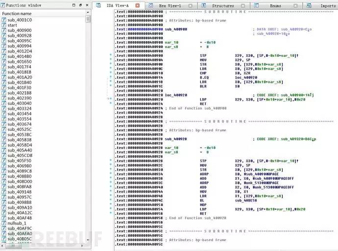 但是,我们将adbd放入IDA一看,发现strip掉了函数符号,IDA在ARM64下没法F5,而且厂商在AOSP基础上做了很多定制,导致使用strings找特征都不好使。