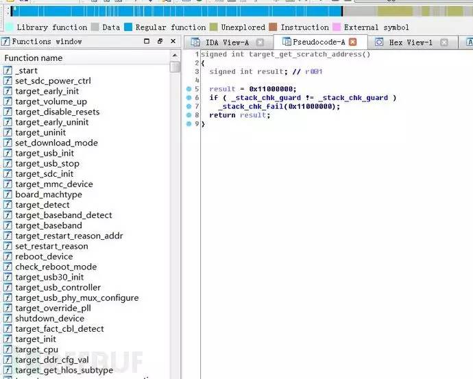 成功提取aboot文件后,放入IDA查看,由于没有删掉符号信息,可以快速定位到target_get_scratch_address函数: