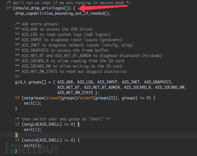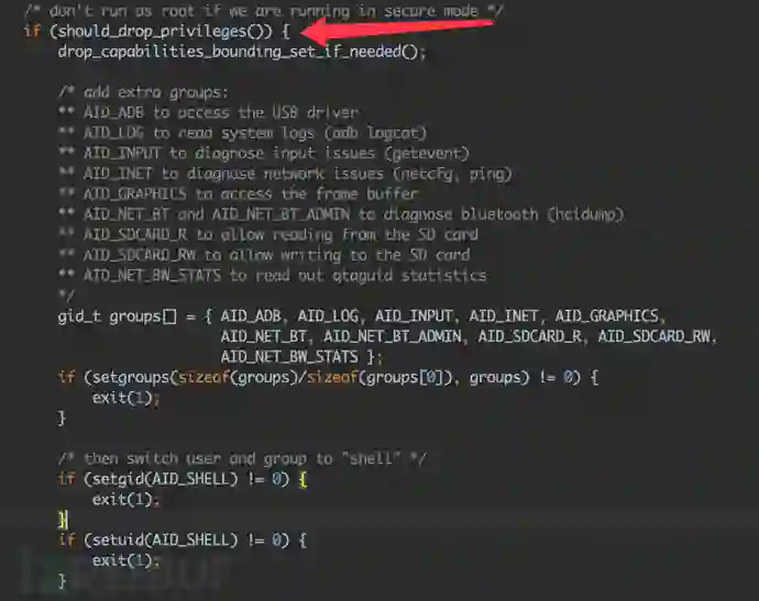 我们想要root提权,一种方法就是patch adbd程序,让adb shell直接以root权限执行,而不是降权执行。在AOSP的adbd源码中我们看到,只要我们patch掉should_drop_privileges的执行,那么就能让adb shell以root权限执行。