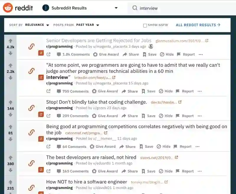 Reddit上的编程分类内容 有大约 200 万用户,其中大多数帖子只有很少的评论,热门一点儿的话题一般也就 100 到 200 条评论。但是如果你在上边搜索“面试”这样的关键词,你看到的热门帖子数可是超越想象。