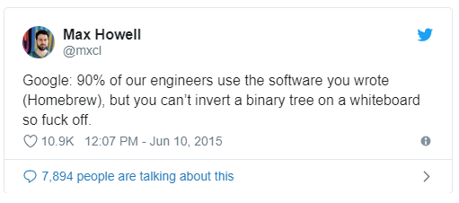 对于这种情况,当我阅读网上的讨论时,遇到的最常见的解释是雇主是白痴。第二种最常见的解释是,雇主都想成为谷歌,而谷歌显然需要计算机科学专家,而其他公司并不需要。但不管怎样,这些雇主还是非常推崇谷歌的招聘流程,希望让自己成为亿万富翁。