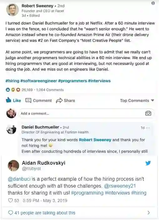尽管如此,我必须指出的是,无论我们在这个行业付出了多大的努力,招聘在很大程度上仍有随机性。精心设计的面试流程总是比随机面试稍微好一点,这就是为什么我们要这样去设计面试流程。但考虑到解雇不合格员工的高昂成本,而且人们总是对误判中的否定比肯定抱有更大偏见,因此,很可能会一直存在这样的恐怖故事:在一家公司,本来明显可以取得成功的候选人,却遭到了机械程序的拒绝。正如 Spolsky 提出的用实习代替面试的建议所显示的那样,尽管存在种种缺陷,但这种制度仍然难以克服。