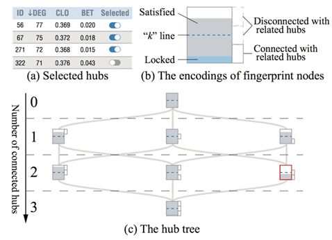 中心指纹保护器分为两个部分,左侧为中心节点选取面板,右侧为中心指纹树。中心节点选取面板呈现了所有节点的结构信息,用户通过这个面板,选取重要的节点作为中心节点。右侧中心指纹树将根据用户的选择进行实时响应,树上每个节点代表了一个中心指纹等价类,即这个等价类中的节点具有相同的中心指纹,树中深度为i+1的等价类节点表示与i个中心节点相邻,所以若n为中心节点的个数,那么树的高度为n+1。