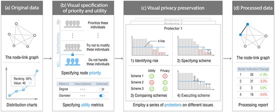 个人数据挖掘和个人隐私保护,并非鱼与熊掌,可视分析的技术手段能够帮助我们保护个人隐私数据,避免后续的数据挖掘暴露隐私的同时,平衡数据质量发生的变化,减少对后续数据挖掘的影响。针对网络数据中的隐私保护问题,浙江大学、加州大学戴维斯分校和阿里云DataV团队,共同发表了最新的研究成果《GraphProtector: a Visual Interface for Employing andAssessing Multiple Privacy Preserving Graph Algorithms》【1】,这项成果也已论文形式收录在IEEE TVCG中。