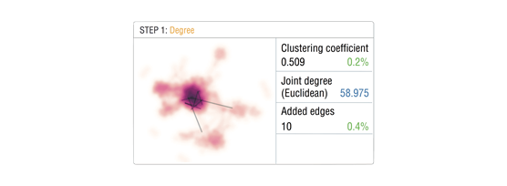历史记录视图使用时间轴的形式可视化了每一步隐私保护操作后数据的变化。在每一个历史记录中,标题描述了该步骤采用的是哪种类型的保护器,记录左侧我们采用CDE(curvedensity estimates)的方法可视化了图的原始分布(即图四a的节点连接图),边越多颜色越深。在CDE得到的分布图上,我们使用深色的直线表示当前处理所增加的边,当用户鼠标移动到一个历史记录时,该步所增加的边将在图四a中高亮出来。右侧则呈现了数据指标的变化,包括指标的当前值和变化量,通过红绿颜色编码指标的增加和递减,而对于不能计算增量的指标,我们用蓝色进行编码。