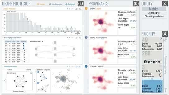 图三 GraphProtector 的隐私保护流程。 a) 数据导入 b) 优先级制定及实用性指标选取 c) 隐私保护处理 d) 数据导出