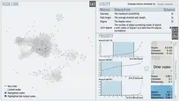 图四 GraphProtector 系统主要初始界面。 a) 节点链接图视图 b) 优先级视图 c) 实用性视图
