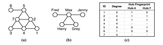 中心指纹:是指在最长路径`i`的限制下,图中普通节点和中心节点们之间的最短路径所形成的向量。这里为了简化复杂度,我们取`i`设为了`1`,即普通节点和中心节点们是否存在相邻关系作为节点的中心指纹(如图二中,图c中HubFingerprint为选取了原始图图a中4号节点和7号节点作为中心的的中心指纹分布);
