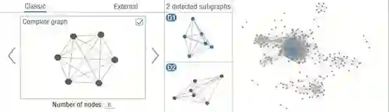 子图保护器分为三个部分,左侧为子图设定面板,使用者通过这个面板设定子图,子图可以来自于一些经典拓扑结构,如形状结构,环形结构等,也支持从外部导入。在子图设定面板中,系统同样通过灰色矩形的个数编码识别得到的子图的个数。中间面板为子图识别面板,将可视化图中识别得到的当前子图结构和相似子图结构,当识别得到的当前子图结构不满足k值时,用户可以选择将相似的子图补全成为当前的子图。右侧子图结构展示面板,使用者可以通过与子图识别面板的交互查看子图在图中的位置。