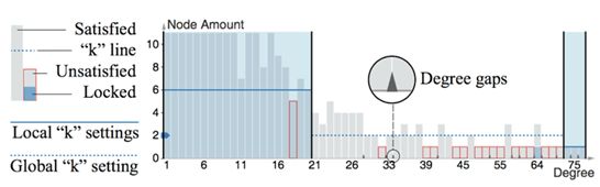 我们采用柱状图可视化了数据中的节点度数分布,横轴编码度数,按照从小到大的顺序排列,此外,在横轴上,我们还设计了一个“度数跳跃”符来编码度数分布之间的跳跃情况。纵轴编码该度数等价类中的节点个数,蓝色和灰色矩形分别编码锁定和未锁定的节点个数。