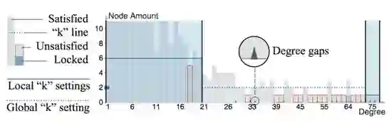 为了减少用户的认知和交互负担,我们设定了纵轴上的最高值,这个值是我们认为的安全值,即当度数等价类中的节点个数超过这个值时,这个等价类一般是安全的,所以当节点度数高于这个值时,我们可以暂且忽略其具体值,而将重点放在那些不满足k值的节点上。系统用虚线来编码整体k值(在系统中,我们称之为k线),辅助用户判断k值和节点个数的关系,从而定位风险所在。使用者除了可以通过滑动坐标轴上滑块来调整当前保护器内的整体k值外,还可以通过刷选度数范围,调整范围内的局部k值(系统中用实线编码),制定更加细致的隐私保护方案。