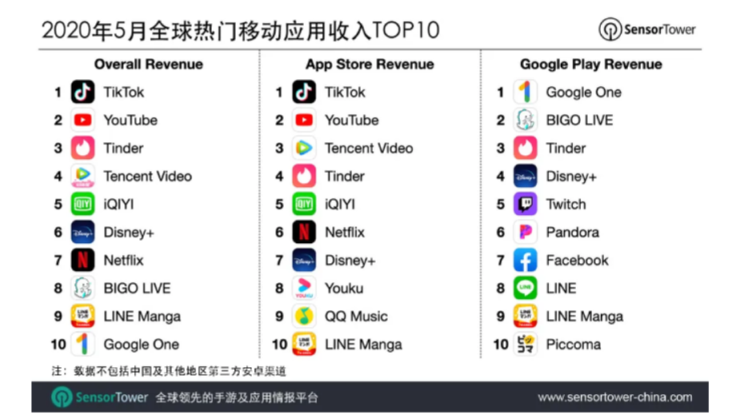 【Sensor Tower:5月抖音及海外版TikTok收入9570万美元,同比增逾10倍】Sensor Tower商店情报数据显示,2020年5月抖音及海外版TikTok在全球App Store和Google Play收入超过9570万美元,是去年5月的10.6倍,蝉联全球移动应用收入榜冠军。其中,大约89%的收入来自中国市场;美国市场排名第二,贡献了6.2%的收入;土耳其市场排名第三,占1.2%。