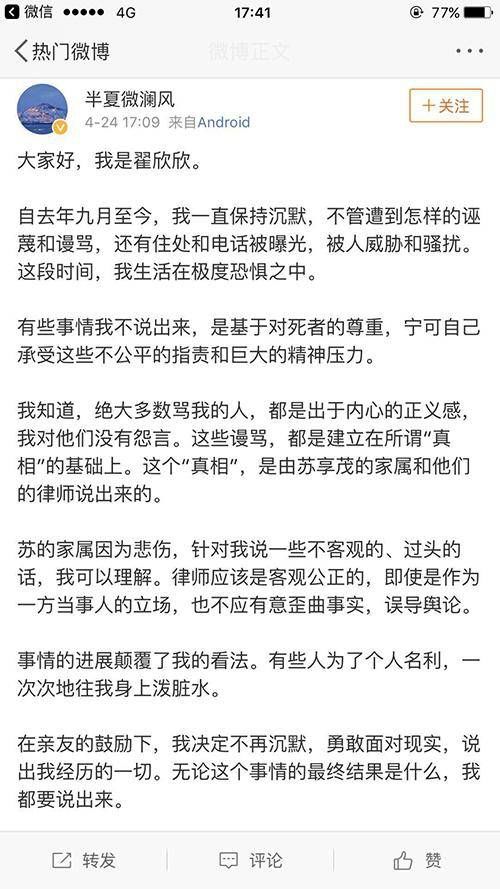 2017 年 9 月 7 日,WePhone 创始人、程序员苏享茂跳楼身亡,并称自己是被在婚恋网站上结识的「毒妻」翟欣欣害死。时隔八个月,翟欣欣昨日在微博首次发声。她在自己的微博「@ 半夏微澜风」上表示,将陆续讲述和苏享茂的交往过程。翟欣欣代理律师易胜华验证该微博用户是翟欣欣本人。