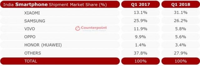 小米第一季度在印度市场份额达 31% ,占市场第一