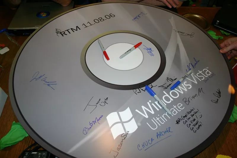 Windows 有这么一个传统:团队成员在新的 Windows 系统版本发布后,会在海报上签上自己的名字(本图是一张 DVD)。而当发布会结束的时候,海报上就会有成百上千个签名。