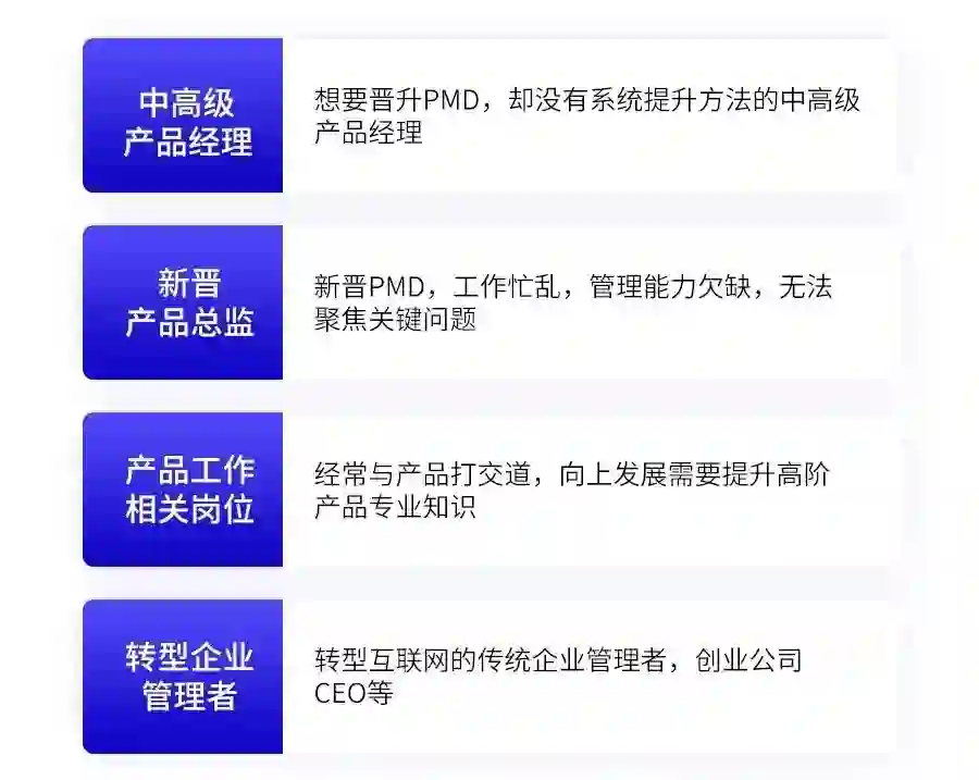 所以推荐以下同学加入学习,课程不建议初阶产品同学学习。