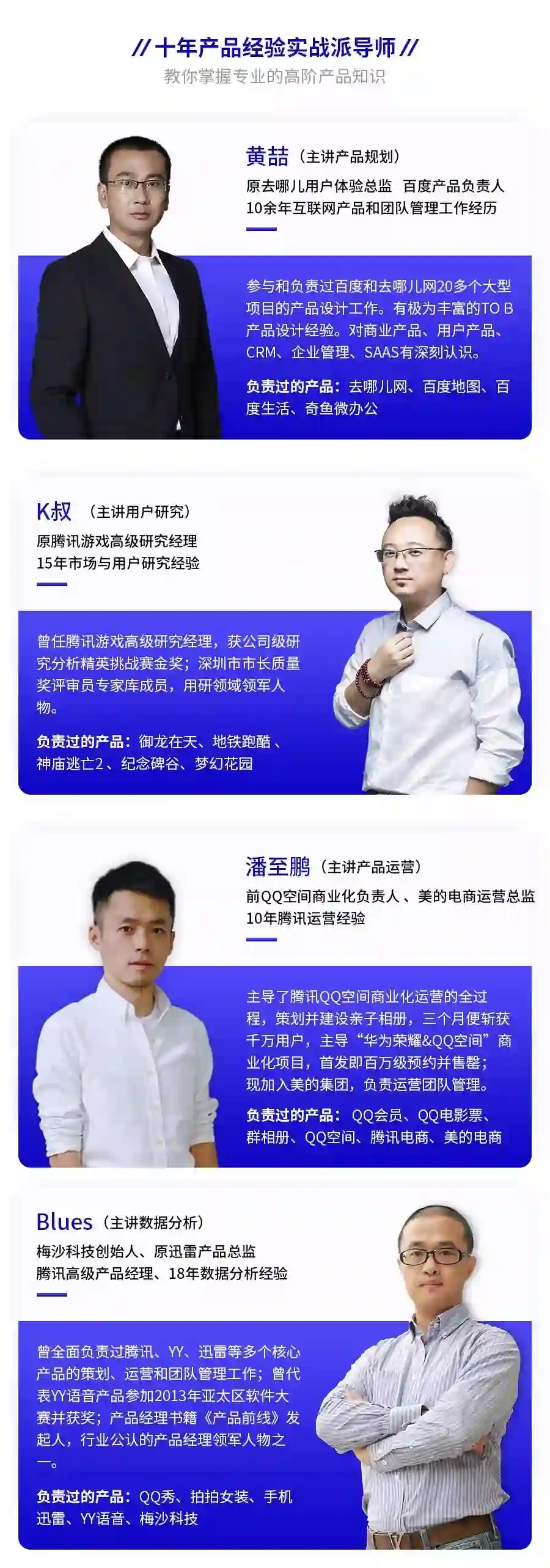 课程包含四大板块内容“产品规划/用户研究/产品运营/数据分析“,每一块内容对主讲老师都有严格筛选。