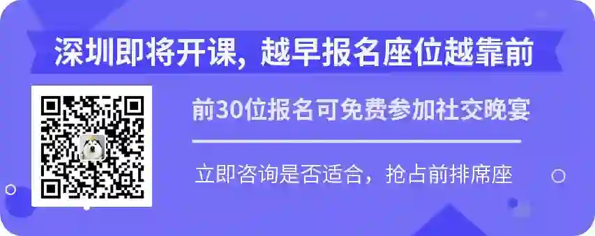 最近一期深圳站,7月13日即将开课,越早报名座位越靠前,前30名报名的同学可以享受免费参加社交晚宴的名额,感兴趣的小伙伴,立即扫描下方二维码,加小助手咨询!