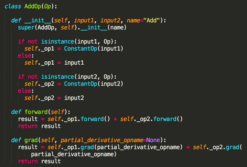 那么用户可以定义的最小操作,也就是 Op,需要平台实现基本的算子,例如 ConstantOp、AddOp、MultipleOp 等,而且用户实现自定义算子时可以加入自动求导的流程中,并不影响框架本身的训练流程。参考 TensorFlow 的 Python 源码,下面我们定义了 Op 的基类,所有的 Op 都应该实现 forward() 和 grad() 以便于模型训练时自动求导,而且通过重载 Python 操作符可以为开发者提供更便利的使用接口。