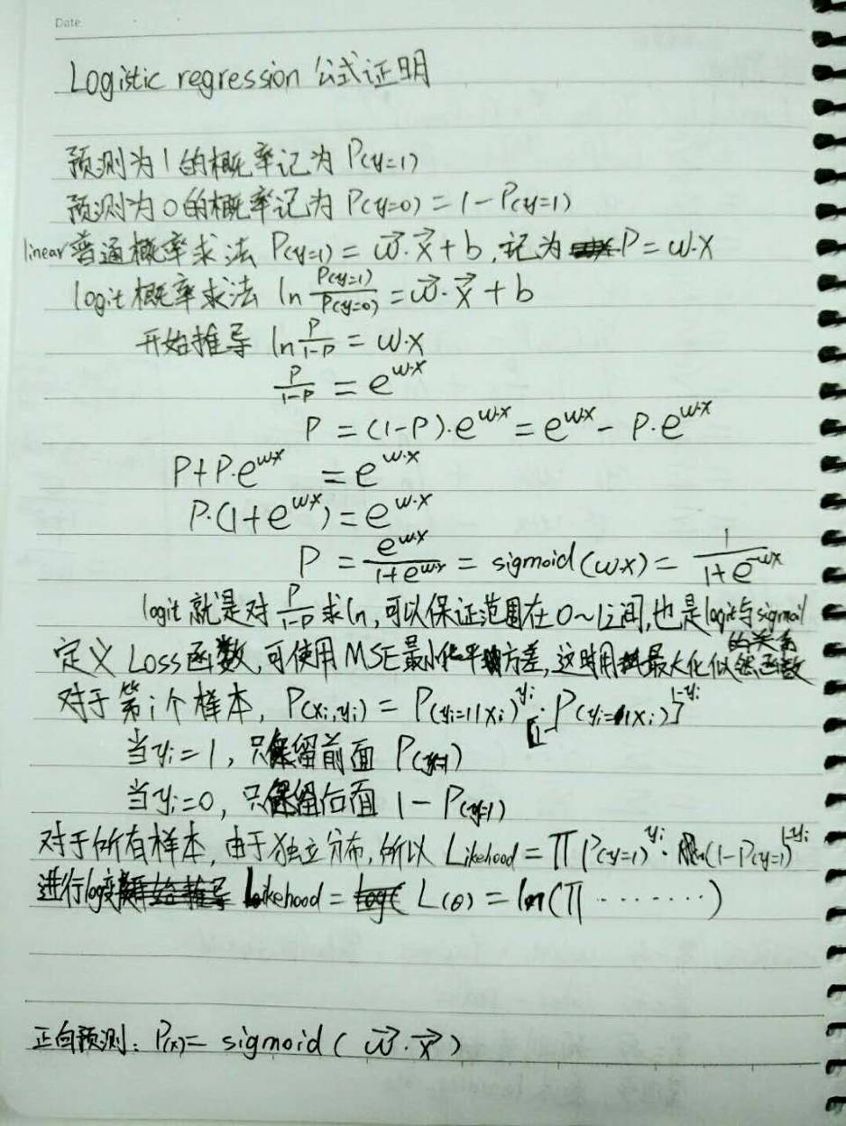 逻辑回归与线性回归类似,当由于是分类问题,因此需要对 w * x + b 的预测结果进行归一化(Normalization),一般使用 Sigmoid 方法,在 Python 中可以通过 1.0 / (1 + numpy.exp(-x)) 这种方式实现。由于预测值不同,Loss 函数的定义也不同,求偏导得到的数值计算公式也不同,感兴趣也可以看看我的公式推导。