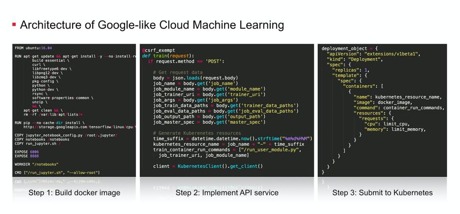 最后,需要实现机器学习场景下的 API 服务。针对机器学习的模型开发、模型训练和模型服务三个主要流程,我们可以定义提交训练任务、创建开发环境、启动模型服务、提交离线预测任务等 API,用熟悉的编程语言来实现 Web service 接口。要实现一个 Google-like 的云深度学习平台,大家可以参考下面这三个步骤。