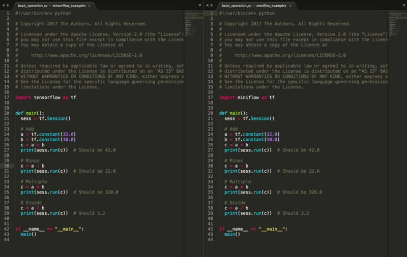 这个项目就是 MiniFlow,一个实现了链式法则、自动求导、支持命令式编程和声明式编程的数值计算库,并且兼容 TensorFlow Python API。感兴趣可以在这个地址参与开发 https://github.com/tobegit3hub/miniflow ,下面是两者 API 对比图。