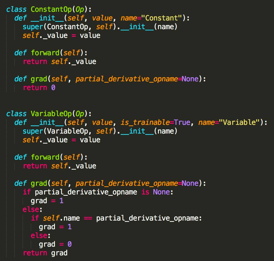 那么对于常量(ConstantOp)和变量(VariableOp),他们的正向运算就是得到的是本身的值,而求导时常量的导数为 0,求偏导的变量导数为 1,其他变量也为 0,具体代码如下。