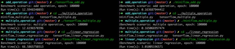 事实上,我个人在学习 TensorFlow 过程中,通过实现一个 TensorFlow-like 的项目,不仅惊叹与其源码和接口的设计精巧,也加深了对声明式编程、DAG 实现、自动求偏导、反向传播等概念的理解。甚至在 Benchmark 测试中发现,纯 Python 实现的项目在线性回归模型训练中比 TensorFlow 快 22 倍,当然这是在特定场景下压测得到的结果,主要原因是 TensorFlow 中存在 Python 与 C++ 跨语言的切换开销。