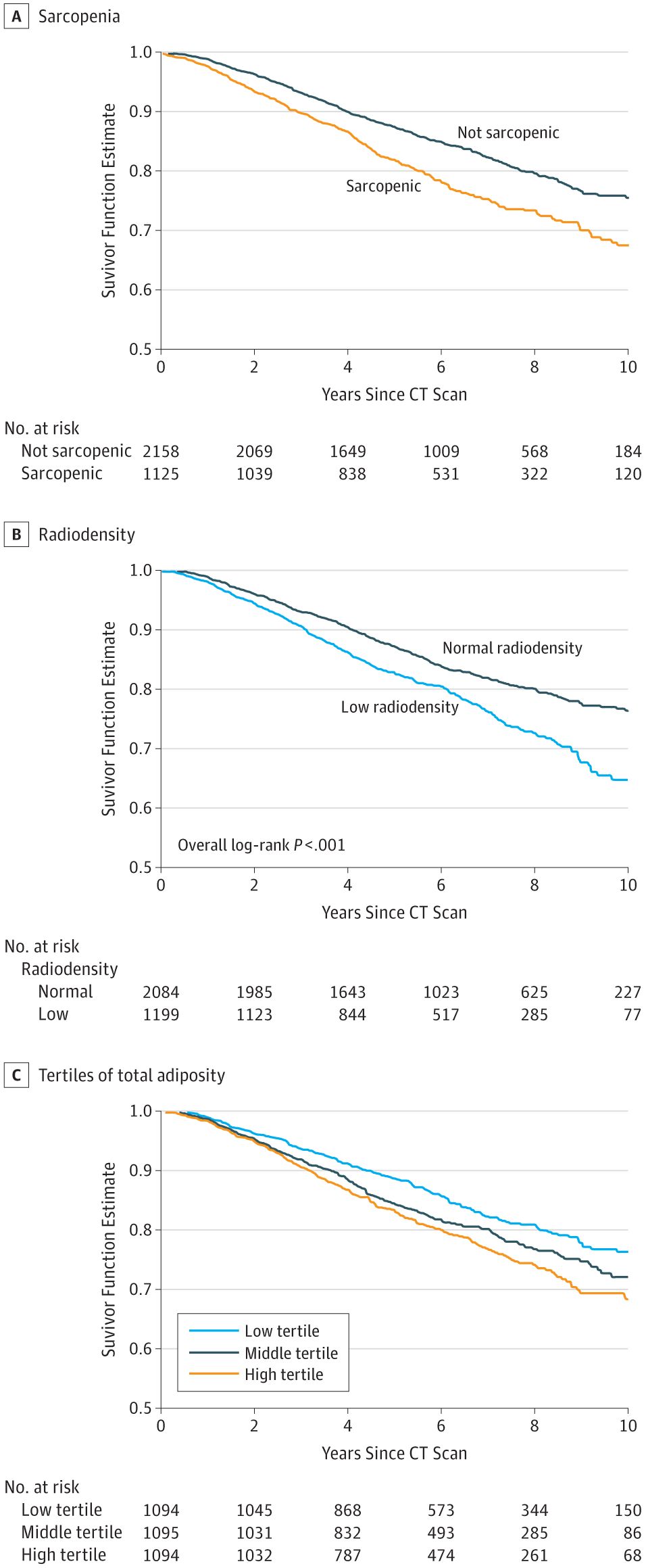 中位随访时间为6.0年,3241例患者中有619例死亡。 在诊断原发性乳腺癌时,1086例患者(34%)出现肌肉减少症,1193例(37%)患有低肌肉放射性密度。伴有肌肉减少症和低SMD(即肌肉质量)的患者年龄更大(分别为57.0岁对52.7岁,60.6岁对50.3岁),并且不太愿意接受化疗。伴有肌肉减少症(n = 1086)与无肌肉减少症(n = 2155)的女性更常见于白人(74.4%比67.8%)和亚洲人(15.3%比11.2%),黑人(3.1%比9.3%)和西班牙裔5.3%vs 10.5%)。Kaplan-Meier曲线显示,与没有肌肉减少症的人相比,患有肌肉减少症的患者(log-rank P <0.001)、低SMD(log-rank P <0.001)、中等或高总肥胖患者(log-rank P <0.001)总体生存更差。