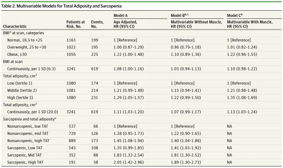 Association of Muscle and Adiposity Measured by Computed Tomography With Survival in Patients With Nonmetastatic Breast Cancer. JAMA Oncol. 2018 Apr 5. doi: 10.1001/jamaoncol.2018.0137.