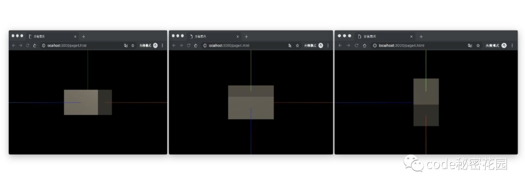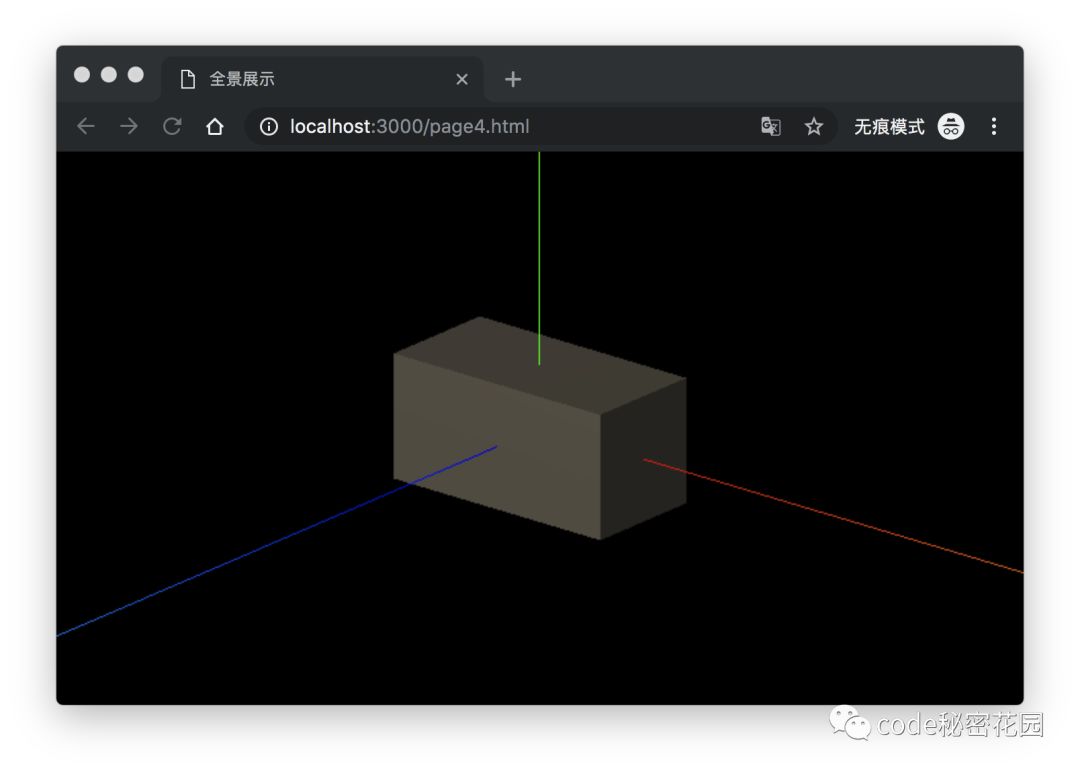 上面看到的几何体的效果,如果不创建一个相机( Camera),是什么也看不到的,因为默认的观察点在坐标轴原点,它处于几何体的内部。