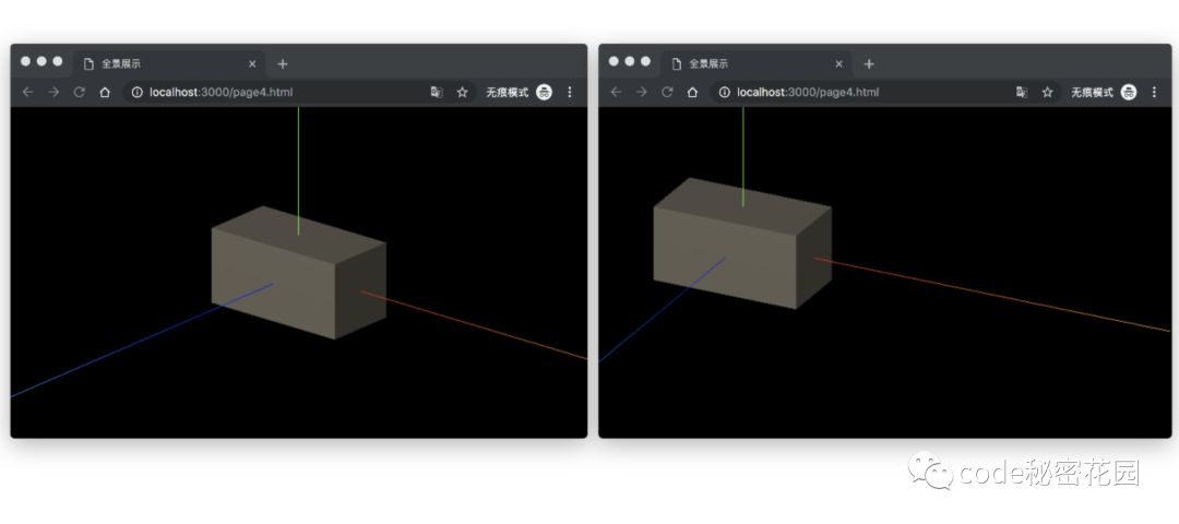 好,有了上面的基础,我们再来写两个例子看一看两个相机的视角对比,为了方便观看,我们创建两个位置不同的几何体: