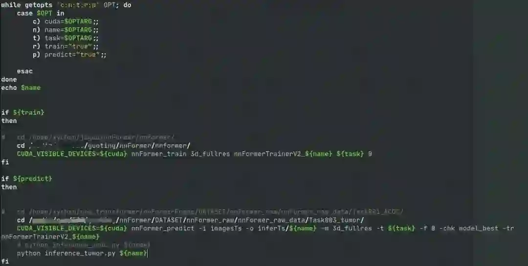 打开 train_inference.sh 文件, 可以看到在predict部分,实际调用的就是 nnFormer_train 功能, 因此我们可以直接调用这个功能做训练.