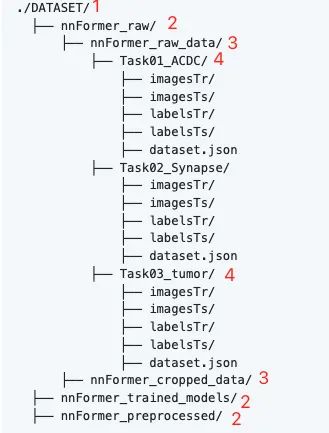 注意:下载的数据有一个dataset.json,这个里面的训练集和测试集同nnFormer不一样。你可以按照现在的划分进行下一步,但是这个测试集里的数据没有ground truth, 在做测试的时候就无法求dice. 如果你想要知道测试集的性能,就按照nnFormer的dataset.json重新划分imagesTr, imagesTs, labelsTr, labelsTs. nnFormer是把训练集再次划分为训练集和测试集,因此他的测试集才有ground truth。(啰嗦这么多,不知道讲清楚么😂)