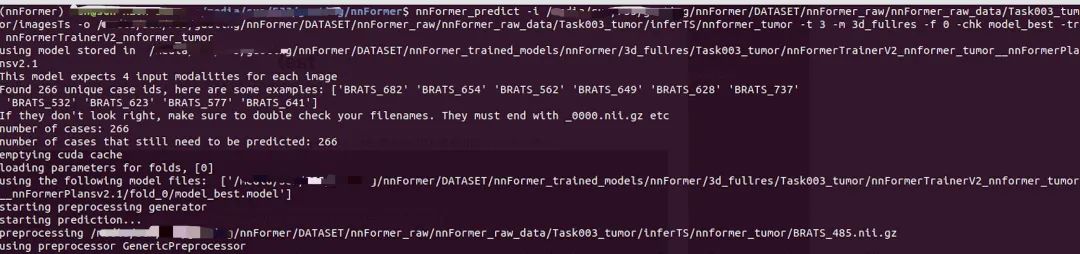 eg: nnFormer_predict -i xxx/nnFormer/DATASET/nnFormer_raw/nnFormer_raw_data/Task003_tumor/imagesTs -o xxx/nnFormer/DATASET/nnFormer_raw/nnFormer_raw_data/Task003_tumor/inferTS/nnformer_tumor -t 3 -m 3d_fullres -f 0 -chk model_best -tr nnFormerTrainerV2_nnformer_tumor