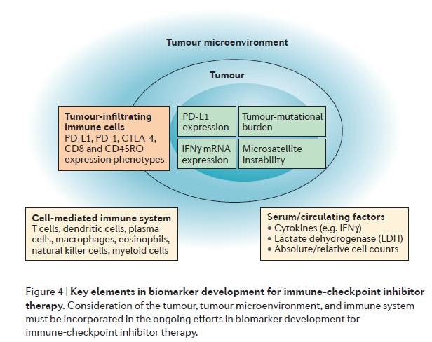尽管对肿瘤和肿瘤微环境特征的评估对鉴定有效的生物标志物至关重要,但患者和肿瘤的临床标志物和形态学表型也有助于将患者分成不同的亚群。常规血液分析中的血清标志物(如乳酸脱氢酶、免疫细胞计数)也能用于患者对免疫检查点阻断疗法响应的预测。事实上,这些标志物已经在预测ipilimumab的响应中显示出了潜在的效用。